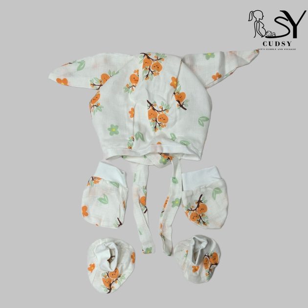 Citrus Blossoms Muslin Mittens, Caps & Booties set